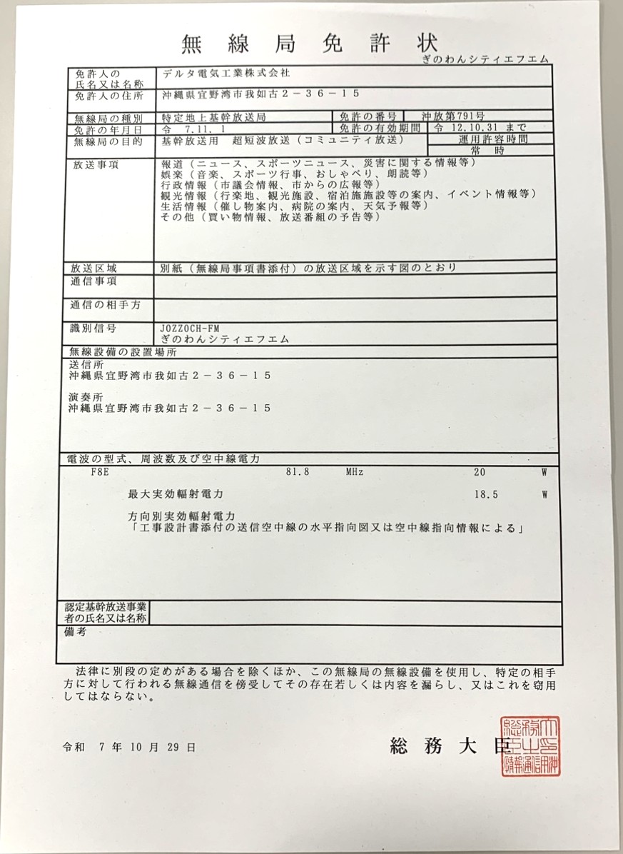 コミニティラジオ放送局の免許更新いたしました。